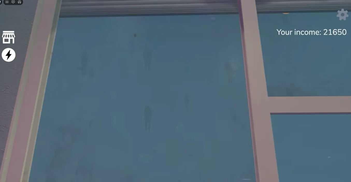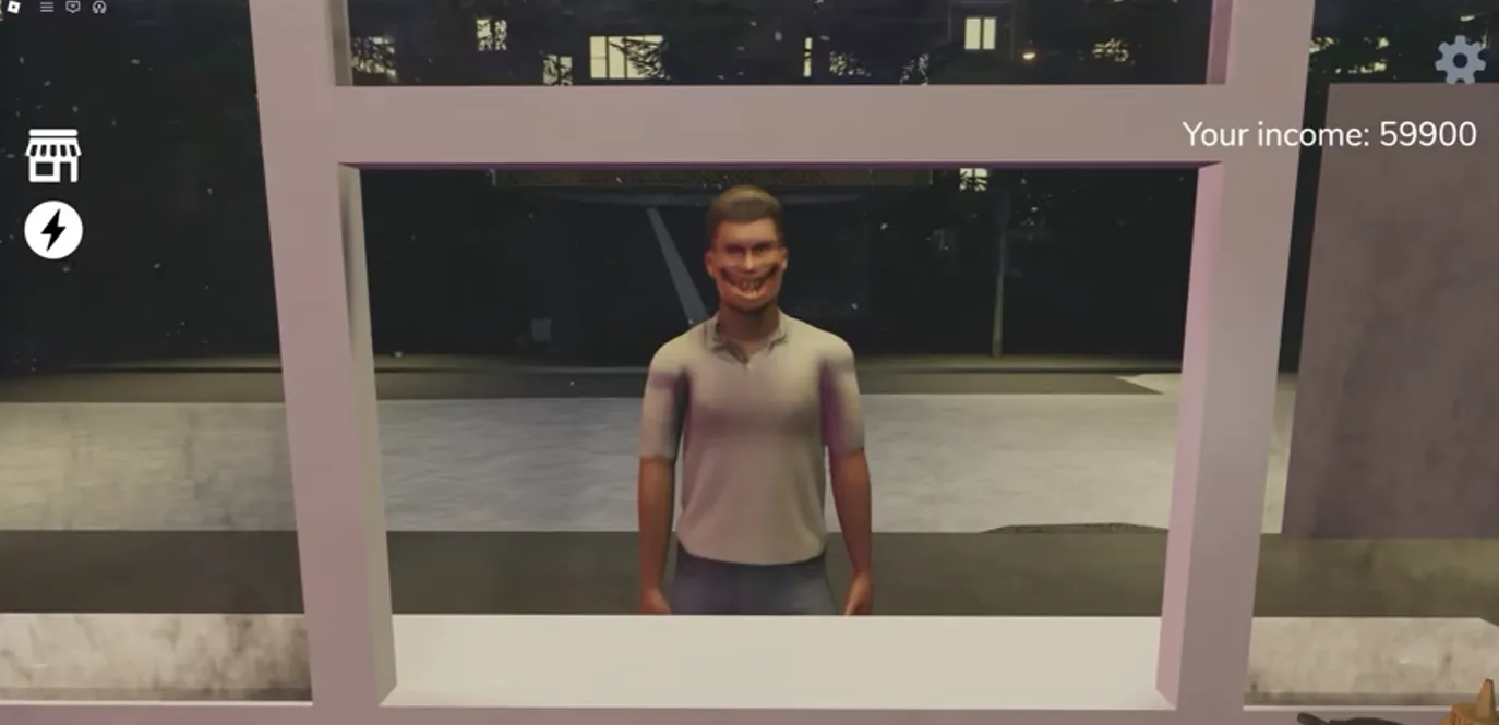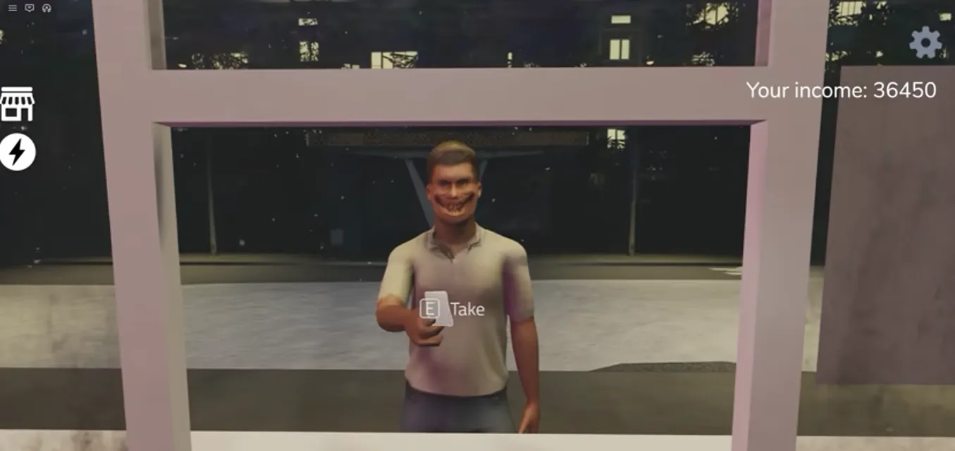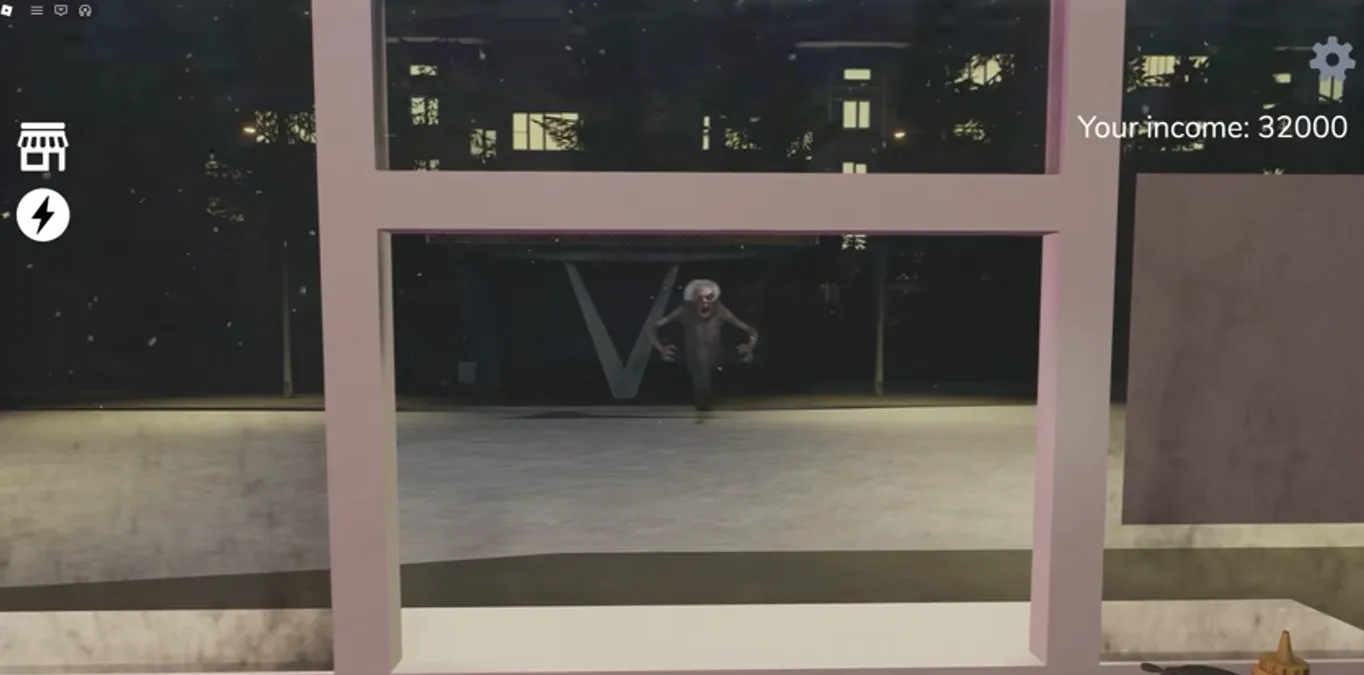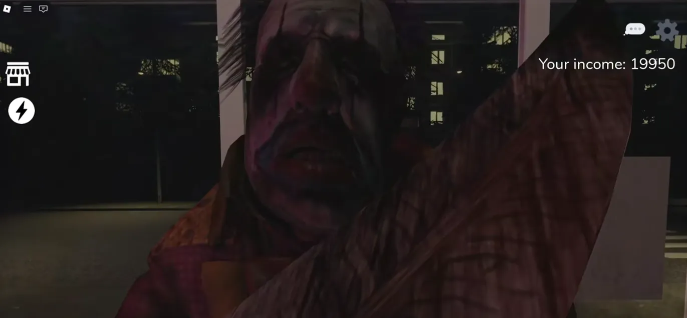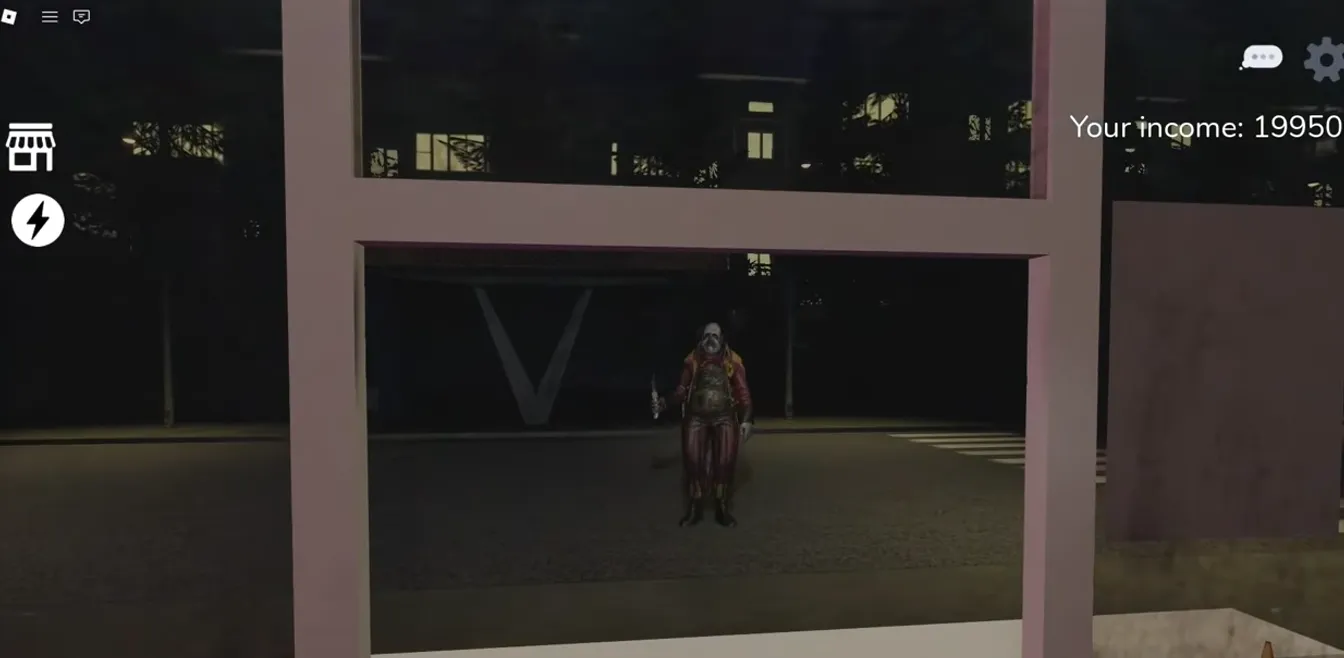 First, a strange sound effect plays, and a clown figure appears across the street, slowly walking towards the store. This situation is quite terrifying. The eerie figure across the street gets closer and closer. Then, it suddenly jumps through the window and appears in front of the player. But don't worry, you don't need to do anything; this is just a jump scare in the game.