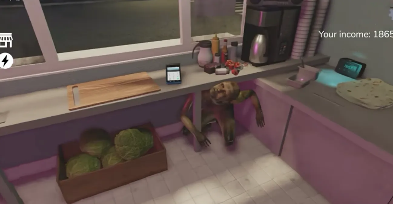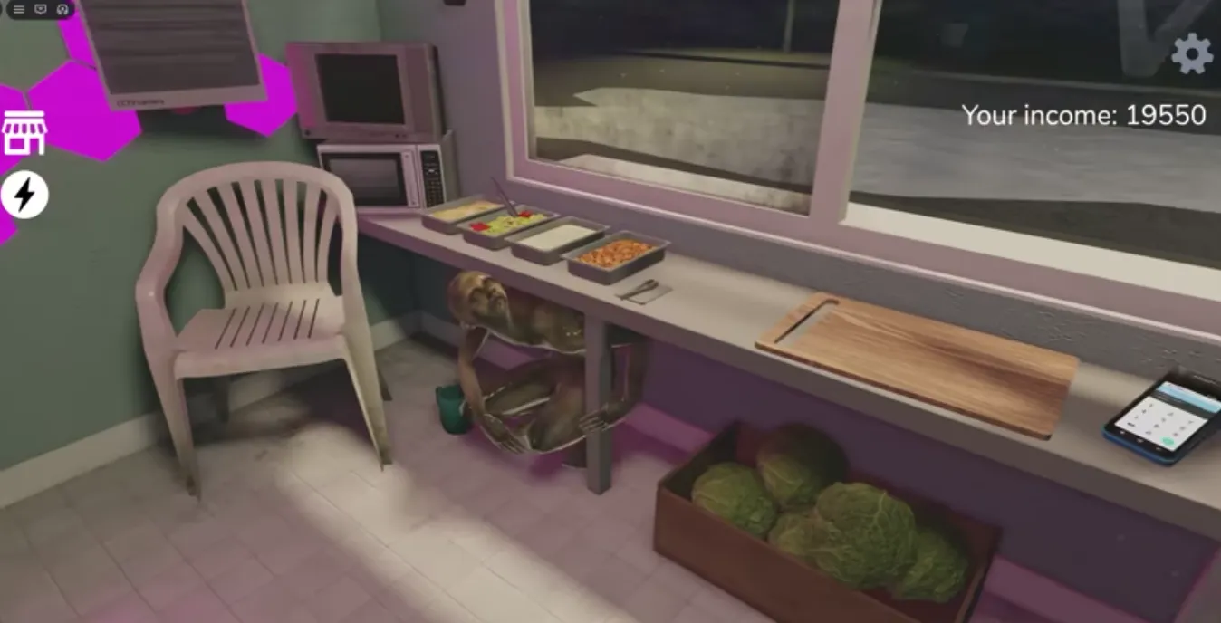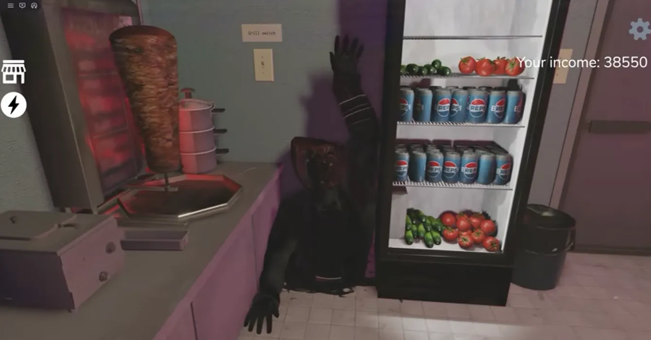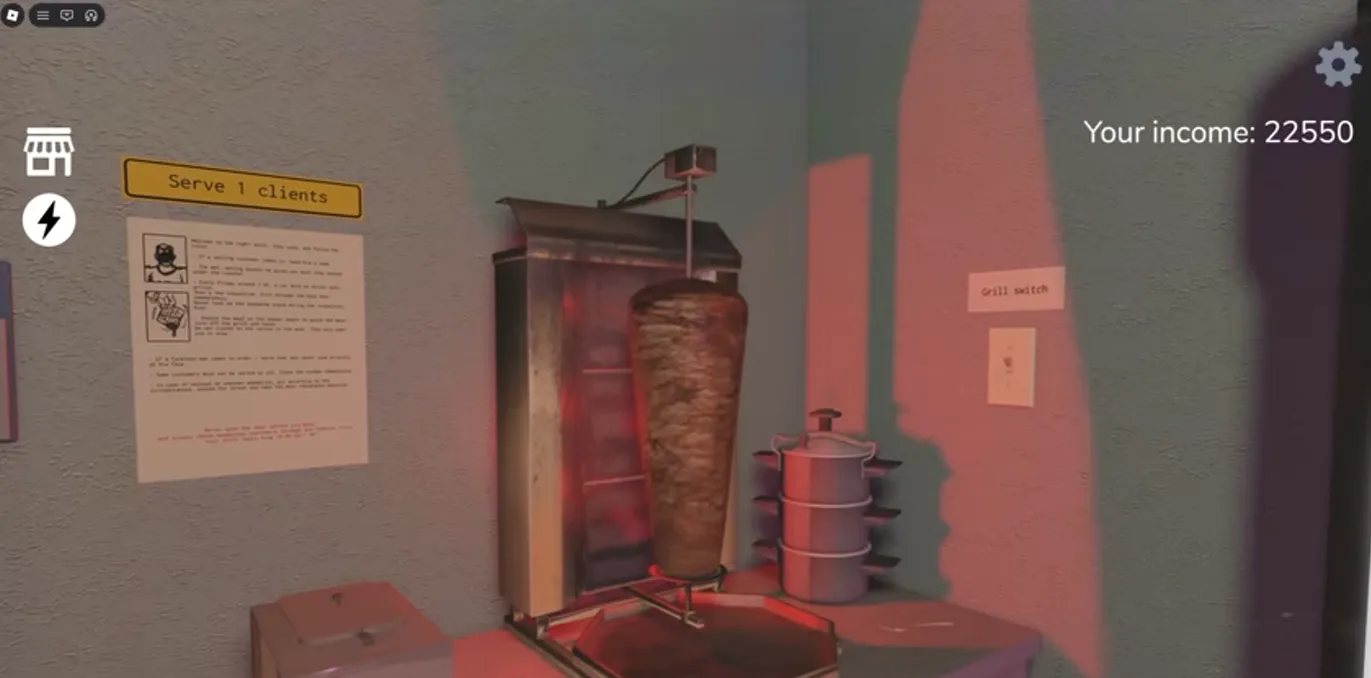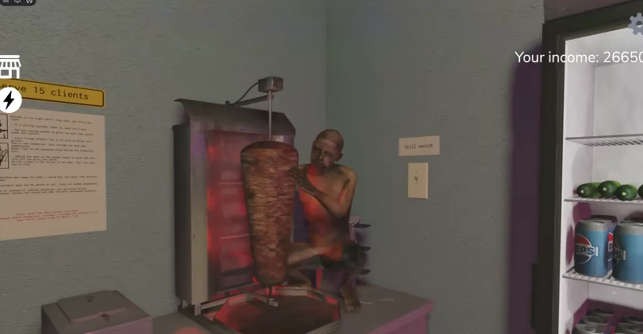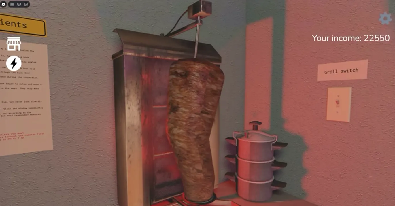 In Scary Shawarma Kiosk, besides having to fend off various paranormal phenomena, even your own meat will turn against you. If the meat on the grill starts pulsating or whispering, immediately turn off the grill (the switch is on the wall to the right of the meat). This sign is easy to miss, but the most obvious sign is when the lights around the meat start turning red.