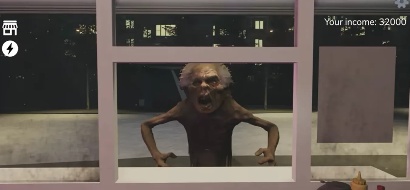 An old man approaches the kiosk, muttering some nonsensical things. In Scary Shawarma Kiosk: the ANOMALY, this monster is different from the others; you need to be careful. Close the window and make this strange man leave.
