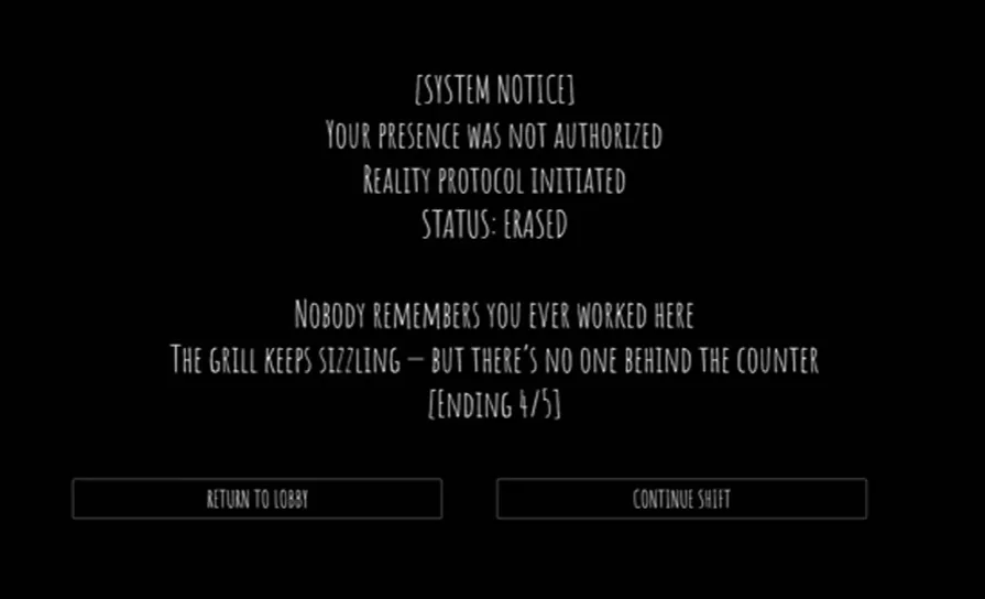 "The Erased Ending" is another ending that requires breaking an important rule to unlock. This rule requires you not to look back at the shawarma stand during the inspection. The inspection event happens every day around 2 AM, without fail.